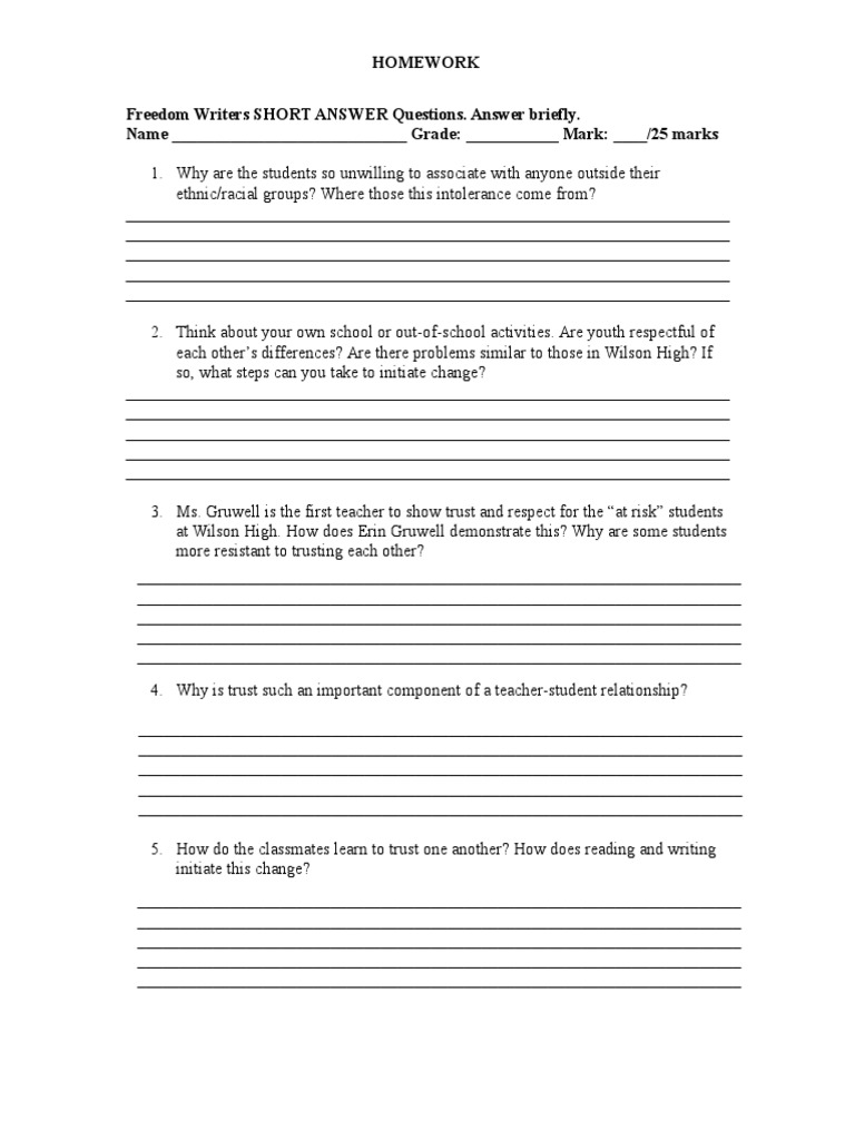 Freedom writers diary movie questions answers. In the two decades since its original publication the book has sold more than one million copies and inspired a major motion. Make a list of at least 8 qualities he must have. Get an answer for How did the books impact the students in The Freedom Writers Diary and find homework help for other The Freedom Writers Diary questions at eNotes.