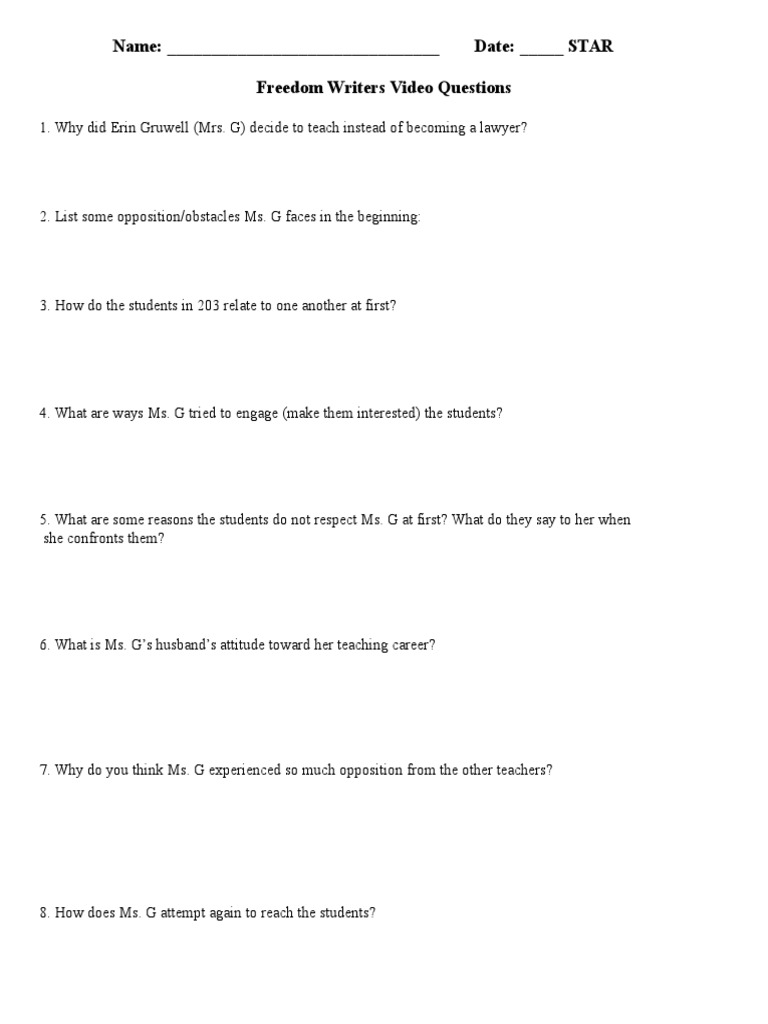 Freedom Writers Video Questions 2 Doc Name Date Star Freedom Writers Video Questions 1 Why Did Erin Gruwell Mrs G Decide To Teach Instead Of Becoming Course Hero