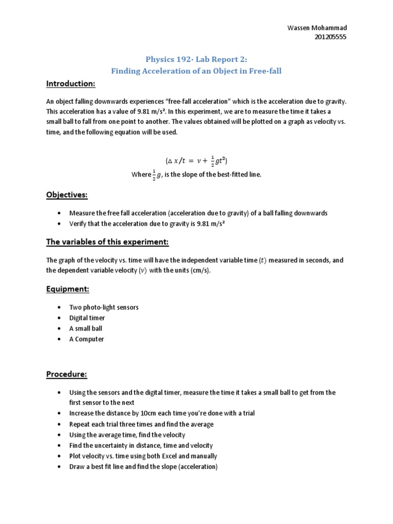 3 Choose one partner to drop the ball one partner to time the drop one partner. Free Fall Lab - Free Fall Physics Lab Report - The Laboratory Report is one of the lots of resources offered to you on the Internet for a variety of education details related to your laboratory work. Free fall lab report.