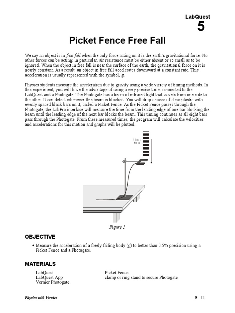 In this Lab we will use a Picket Fence Free Fall through a photogate technique 6 and use these kinematic formulas for velocity v and position y. A free falling object is an object that is falling under the sole influence of gravity. During free-fall the only force that should be acting upon the object is the earths.